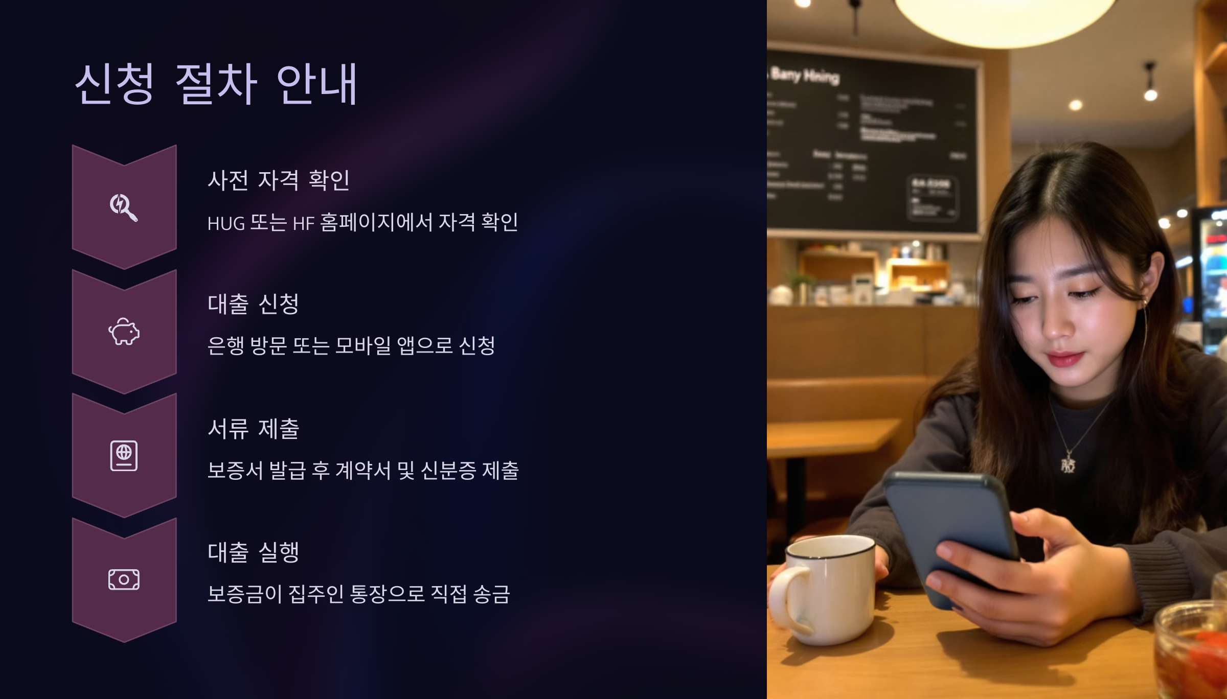 1. 주택도시보증공사(HUG) 또는 한국주택금융공사(HF) 홈페이지에서 사전 자격 확인 2. 은행 방문 또는 비대면 모바일 앱으로 대출 신청 3. 보증서 발급 후, 계약서 및 신분증 등 서류 제출 4. 대출 실행 (보증금 통장으로 직접 송금)