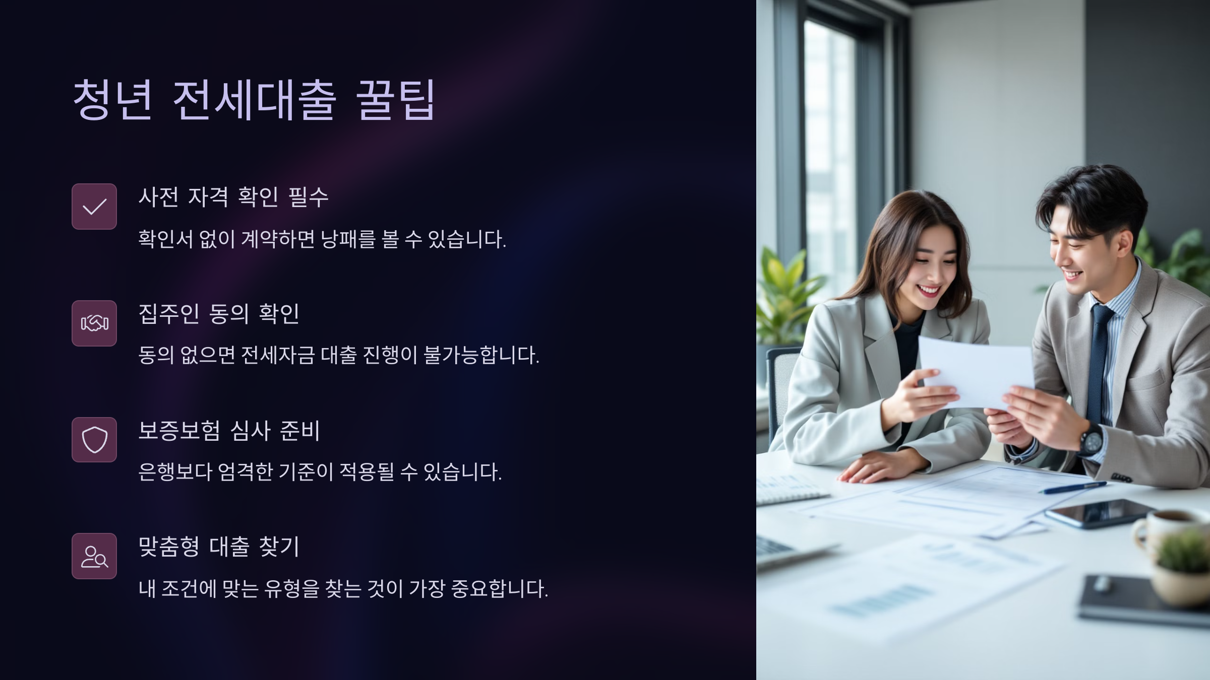 대출 전 계약서를 미리 작성하면 낭패를 볼 수도 있으니, 사전 자격 확인 없이 계약금부터 넣는 건 절대 금지예요.