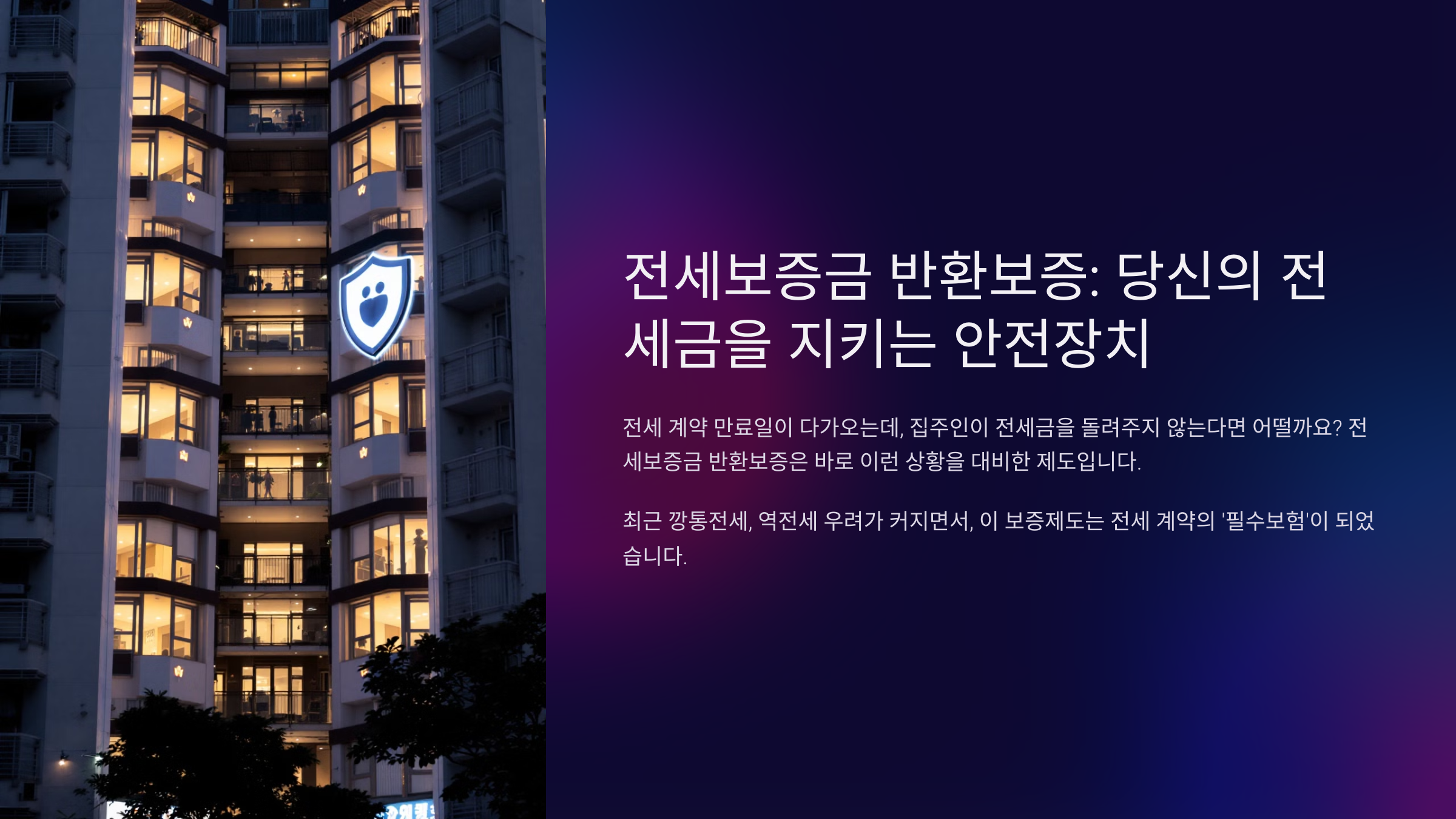 전세 계약 만료일이 다가오는데, 집주인이 전세금을 돌려주지 않는다면 어떨까요? 전세보증금 반환보증은 바로 이런 상황을 대비한 제도예요. 최근 깡통전세, 역전세 우려가 커지면서, 이 보증제도에 가입하는 것이 전세 계약에서의 '필수보험'처럼 여겨지고 있습니다.