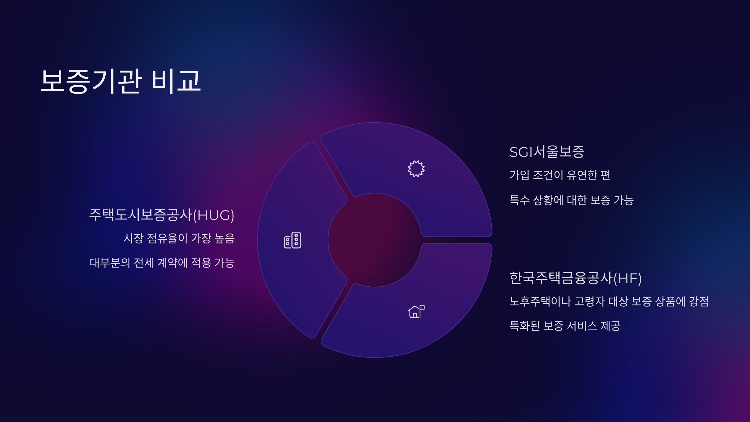 이 중에서도 HUG가 시장 점유율이 가장 높고, SGI는 가입 조건이 유연한 편이에요. HF는 일반적으로 노후주택이나 고령자 대상 보증 상품에 강점이 있어요.